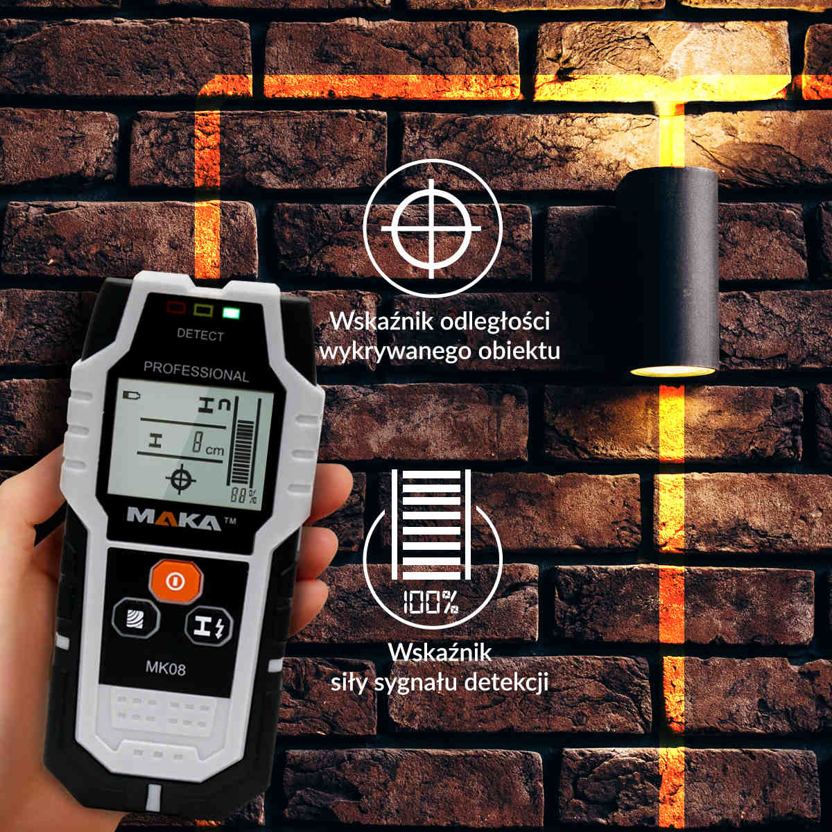 Obawiasz się wysokich kosztów remontu? Przypadkowych zniszczeń instalacji, podczas kucia lub wiercenia? Cyfrowy detektor przewodów MAKA MK08 precyzyjnie lokalizuje zatopione w ścianach przewody i rury. Skraca czas remontu do minimum i chroni cię przed dodatkowymi stratami.